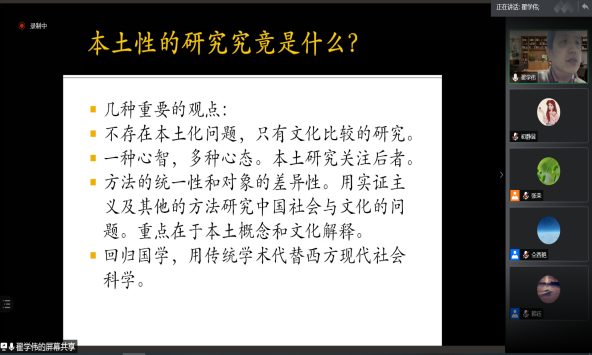 翟教授首先从社会科学的本土化开始讲解,他认为社会学作为社会科学的基础学科要借助本土化来进行研究,在此基础上,翟教授提倡我国社会学家,包括学生应该投身于本土化研究,而不仅仅只是被动的吸收本土研究的有关知识。随后翟教授提出以关系作为讨论本土研究的基础,从关系角度切入来解读中国人的行为方式。翟教授通过对西方社会的脸面观和中国社会的脸面观进行比较,得出了中国人的社会不是脸的而是关系的结论,其中关系是最重要的。同时翟教授提出了用脸面观做本土化研究来研究中国人的行为特点仍然有一些局限,即这种研究会受制于本地区的文化底蕴。最后,翟教授向我们生动的讲解了以时间性和空间性构成的关系向度。