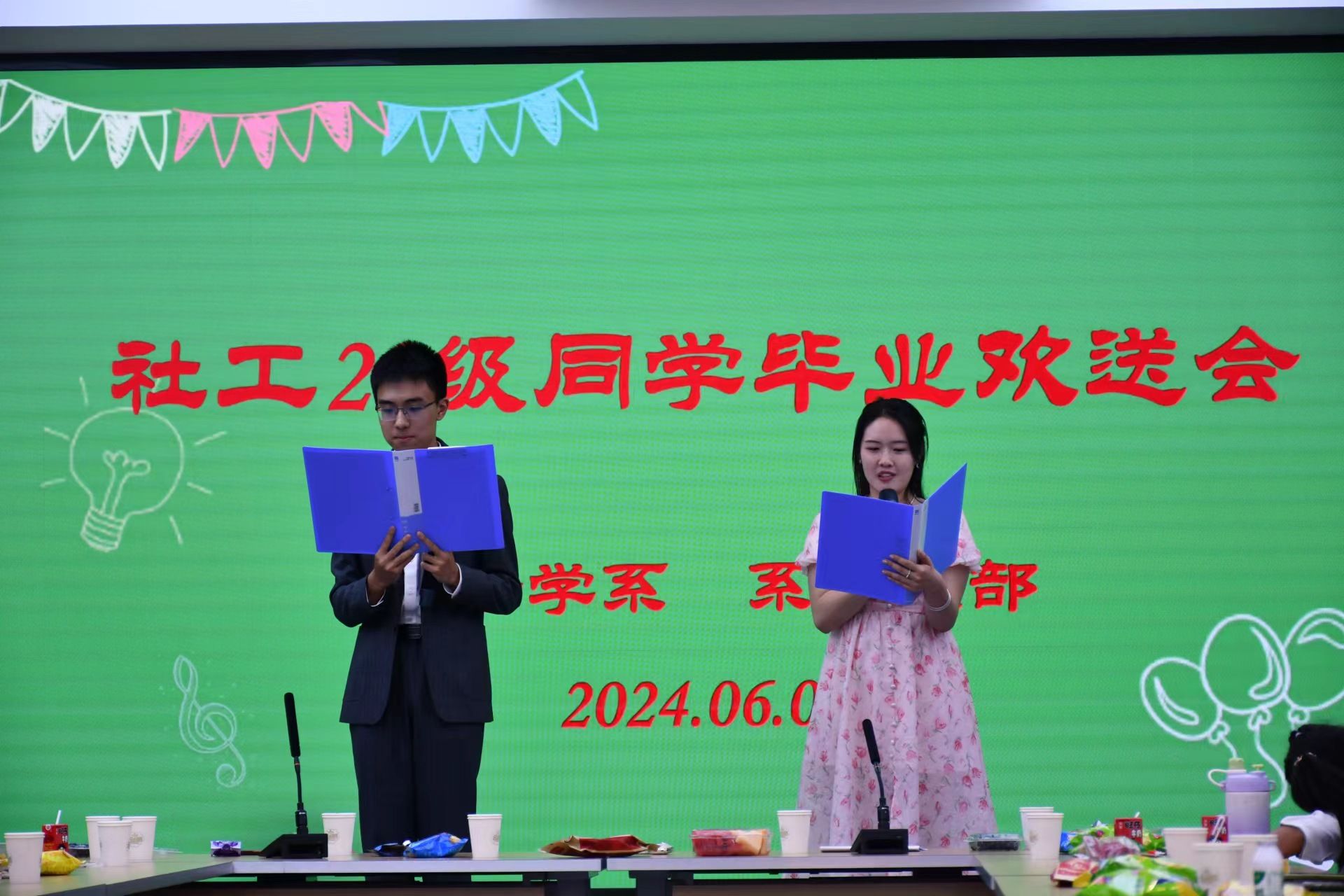 2024年6月6日晚,我院社会学系与系党支部在学校第五会议室举办社工20级毕业同学欢送会暨座谈会。学院党委书记李春慧,学院党委副书记、院长高功敬,学院团委书记刘晓娟,社工20级辅导员赵朔,社会学系教师,社工20级同学以及其他年级同学代表等参加。