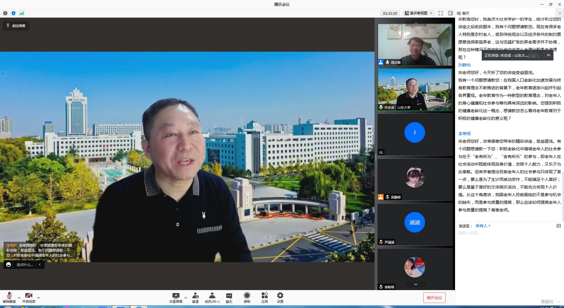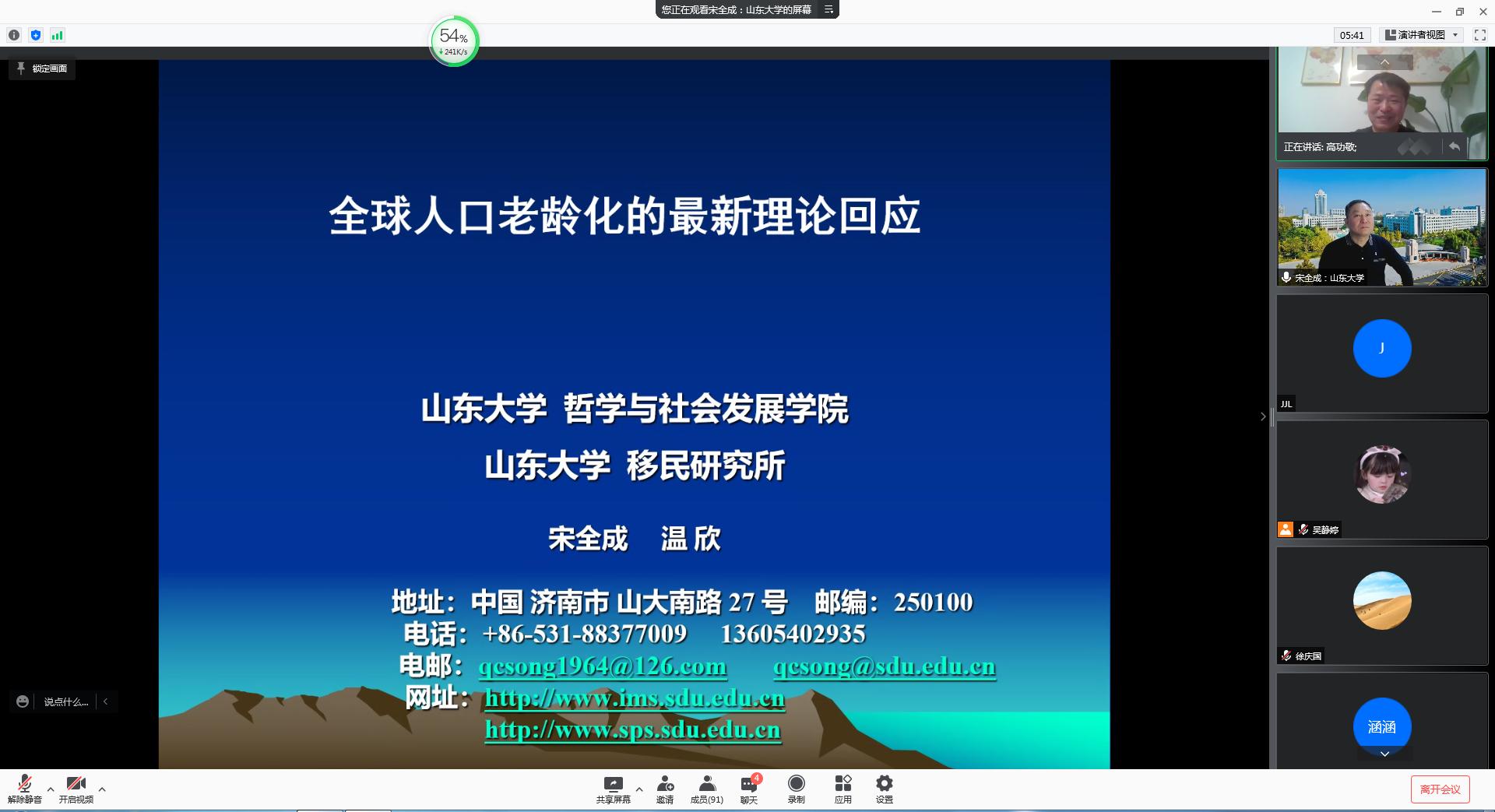 必赢电子游戏网站青龙山学术论坛暨社会学学科设立十五周年系列学术讲座于12月18日晚7点在腾讯会议平台线上举办,此次论坛邀请山东大学移民研究所所长、山东大学哲学与社会发展学院宋全成教授作题为《全球人口老龄化的最新理论回应》的学术报告,报告由高功敬教授主持,学院相关教师及社会学研究生共100余人线上参加。