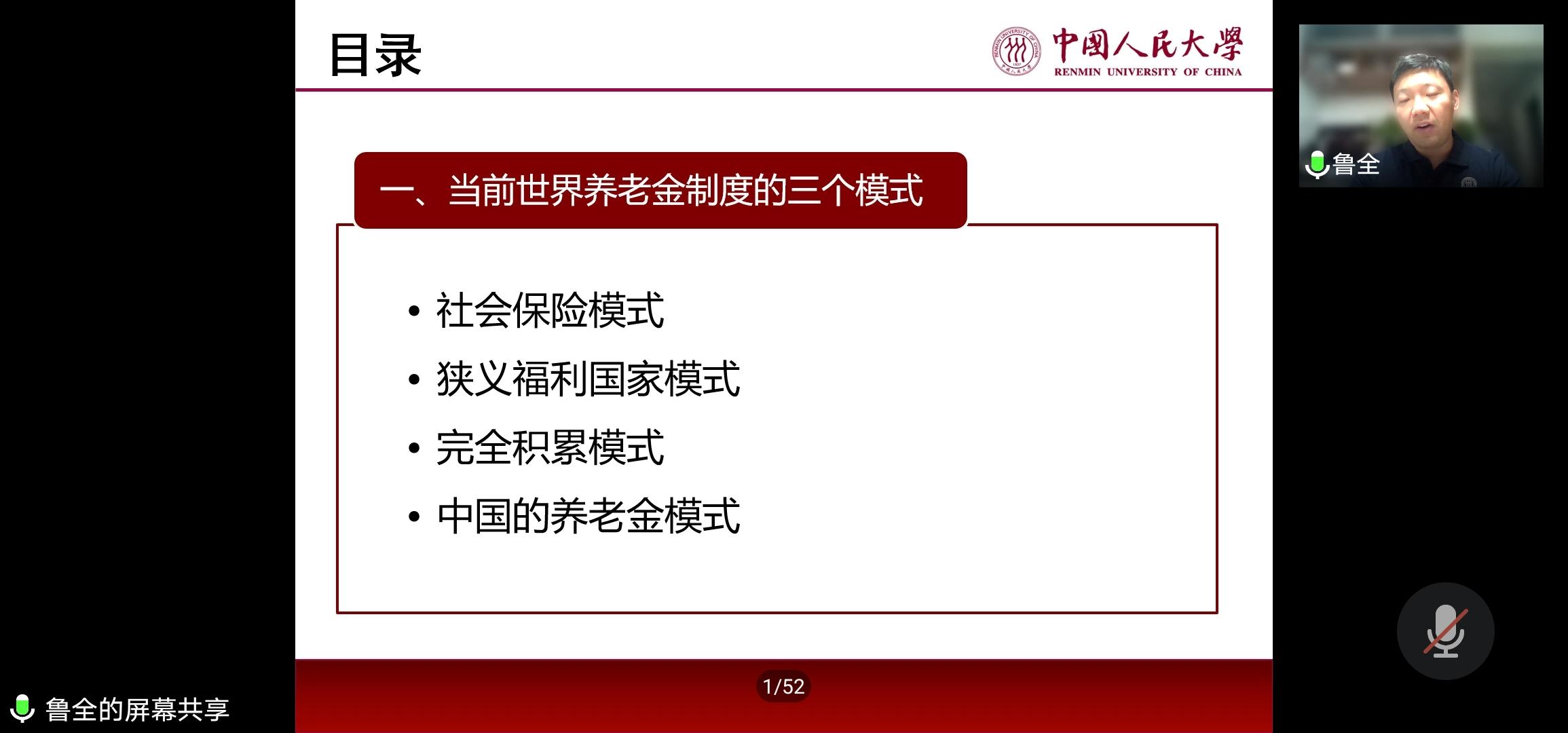 鲁全秘书长从国际视野下的养老保险制度展开,深入对比分析了当今世界养老保险制度的三种模式:社会保险模式、狭义福利国家模式、完全积累模式;落脚至中国养老保险制度,提出了中国养老保险制度改革的十大关键问题。在分析世界养老金制度的三种模式时,鲁全秘书长分别从三种模式的建立背景、基本内容、基本特征、基本功能四个方面展开,详细阐述了三种模式的运行逻辑:一是年轻人上缴养老保险费给政府或者机构等到年老时再将养老保险金返还,做到精算原则,实现权利与义务相结合;二是年轻人上缴税收给国家,国家再将养老金返还给老年人,实现普遍性与均等化;三是年轻人在年轻时储蓄资金用于养老。鲁全秘书长最后对中国养老金保险制度改革中的中国城镇化与养老保险制度改革、养老保险制度全国统筹、养老保险征缴体制、社会保险费税之争等问题进行了具体讲解。在交流互动环节,鲁全秘书长同与会师生就实现养老保险全国统筹、“农民工”能否获得养老保险保障、我国养老保险制度未来发展趋势等热点问题进行了热烈交流。