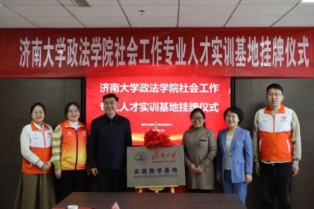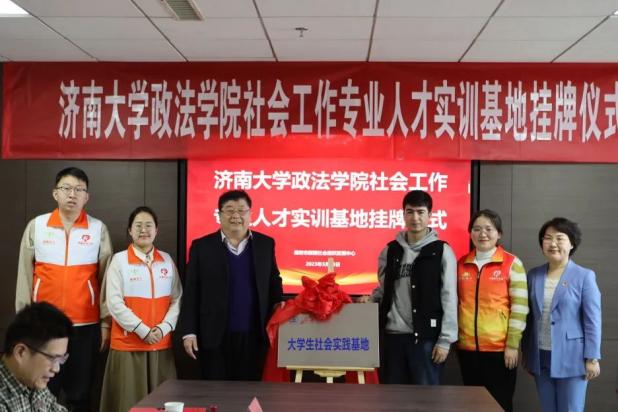 仪式伊始,潍坊市新路社会组织发展中心理事长曹冬梅就新路社会组织发展中心的发展历程与现状,以及潍坊市青州市、坊子区和高新区的社会工作服务站发展状况等做了介绍;随后,社会学系主任韩钰对我院及社会工作专业的发展情况,以及社会工作专业的实习、就业需求等进行说明。之后,双方还就人才实训基地成立的意义进行了交流。最后,我院和潍坊市新路社会组织发展中心本着“优势互补、资源共享、互惠共赢、共同发展”的原则,签署人才实训基地协议,并为济南大学实践教学基地、济南大学就业实习基地和济南大学大学生社会实践基地揭牌。