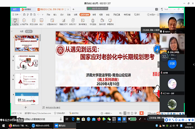 4月10日下午,必赢电子游戏网站“青龙山论坛•线上系列论坛”第二期顺利举行。本次活动邀请北京大学社会学系教授、博士生导师陆杰华,采用腾讯会议直播的方式作了题为《从遇见到远见:国家应对老龄化中长期规划思考》的线上讲座。讲座由必赢电子游戏网站院长梁丽霞主持,同时邀请中国人口学会副会长、南开大学原新教授担当联席主持人,必赢电子游戏网站130余位师生在线参加。