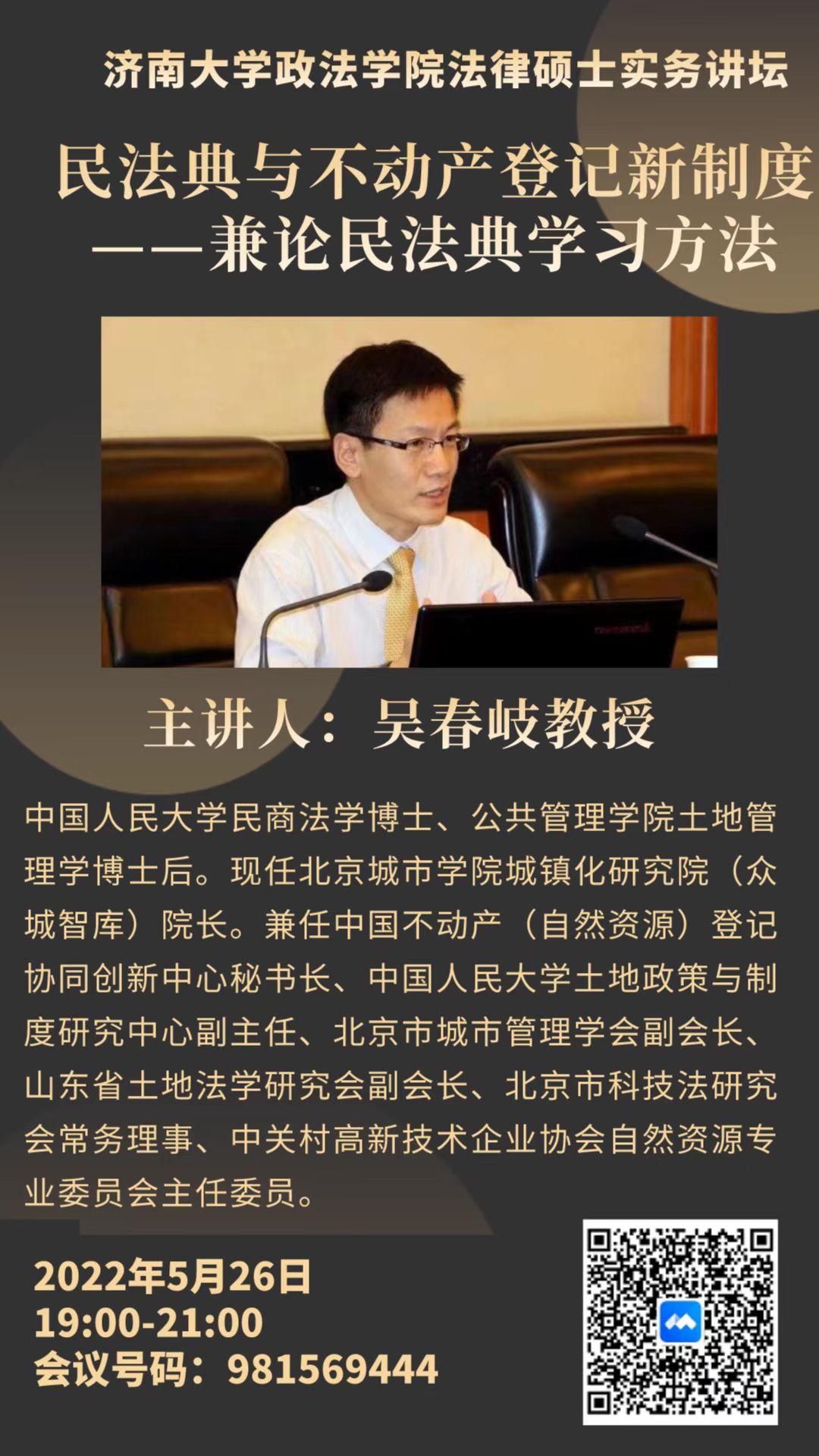 我院法律硕士实务讲坛于5月26日晚7点在腾讯会议平台线上举办,此次讲坛邀请了北京城市学院城镇化研究院(众城智库)院长吴春岐教授作题为《民法典与不动产登记新制度——兼论民法典学习方法》的学术报告。此次报告由法学系刘康磊副教授主持,学院党委书记徐庆国、学院部分教师及全体法律硕士研究生共100余人参加了此次讲座。