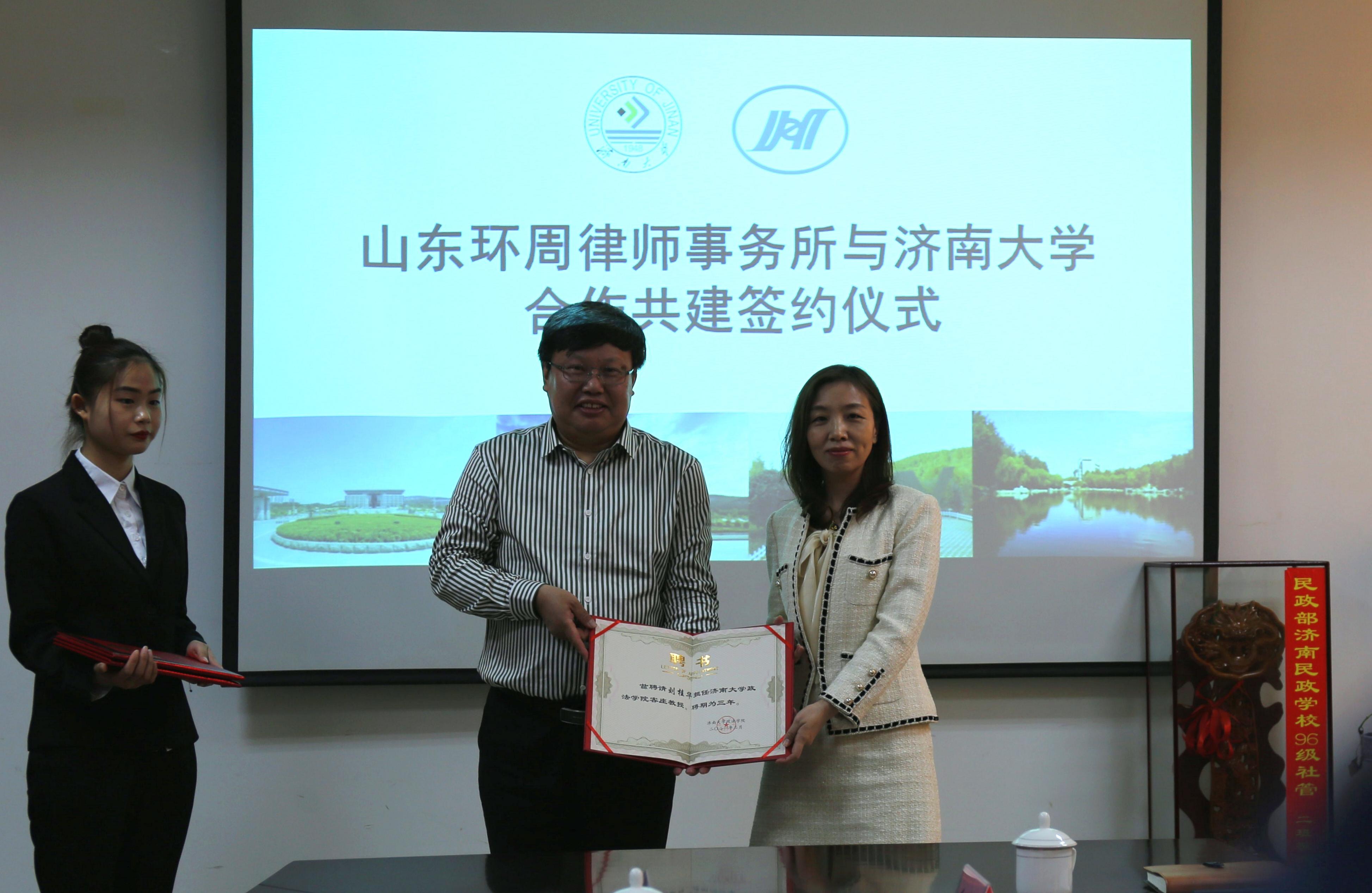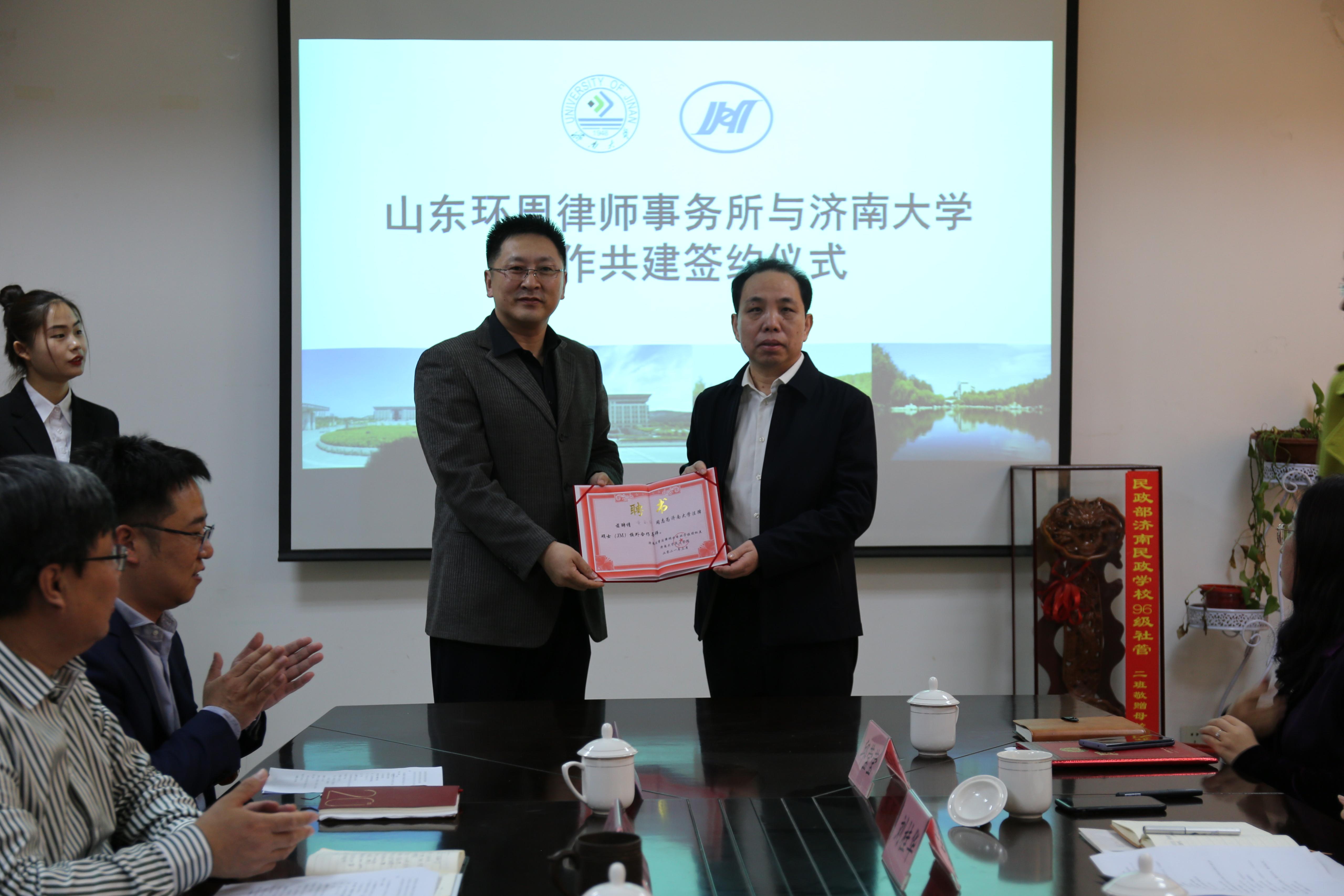 为实施“律所——高校联合培养”机制,创立常态化、规范化的法律人才培养模式,搭建培养应用型、复合型法律专业人才的实践平台,3月25日,山东环周律师事务所与必赢电子游戏网站合作共建签约仪式暨客座教授和法律硕士校外培养导师聘任仪式在济南大学成功举行。济南大学合作发展处处长卢旺、必赢电子游戏网站党委书记徐庆国、社科处副处长孙成豪、必赢电子游戏网站副院长刘康磊、法律硕士中心主任陈强和环周所主任黄金华、执行主任刘桂华、党支部书记孙家磊、副主任邱莹莹等出席仪式。必赢电子游戏网站教师代表、必赢电子游戏网站硕士生代表参加本次活动。签约仪式由必赢电子游戏网站副院长刘康磊主持。