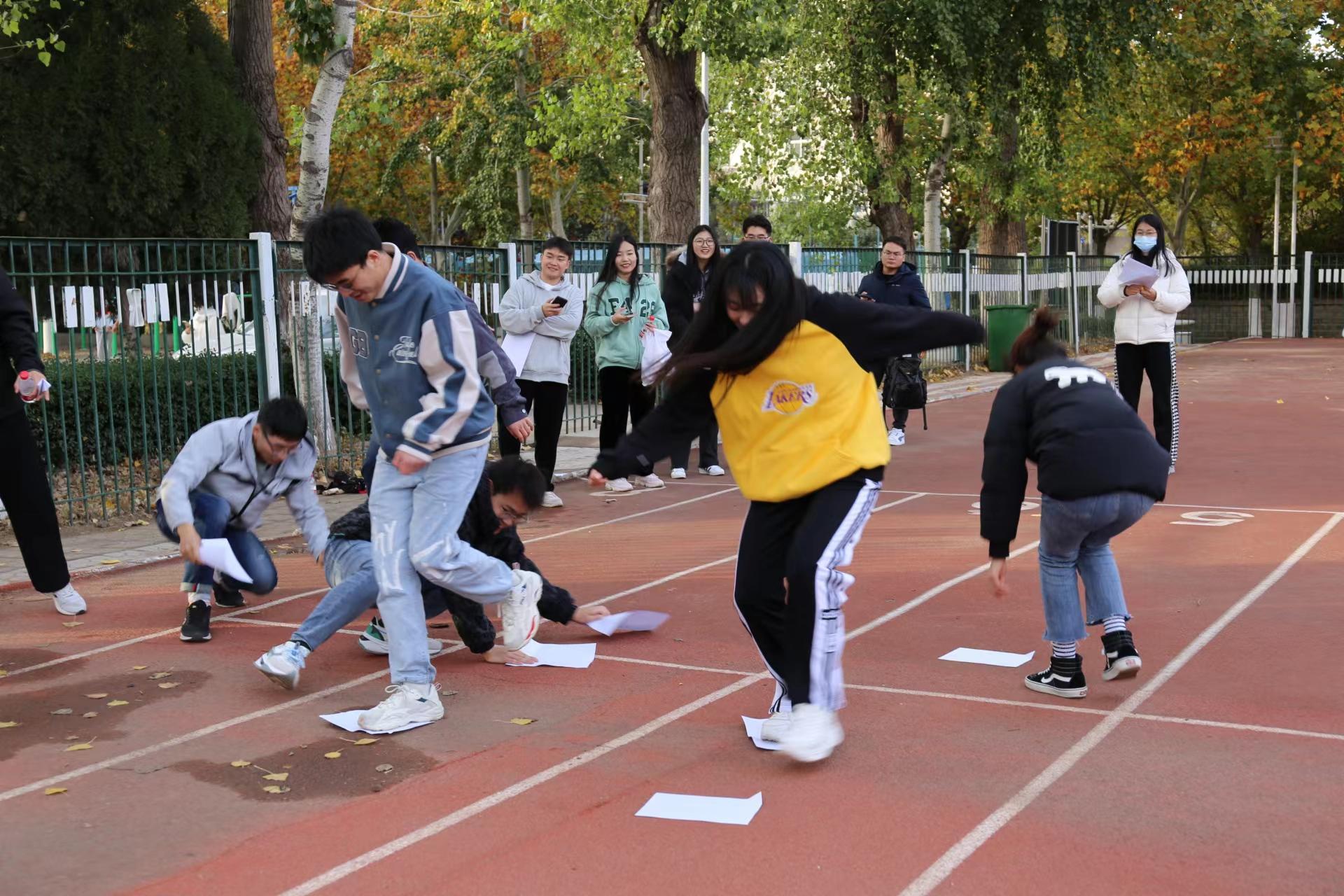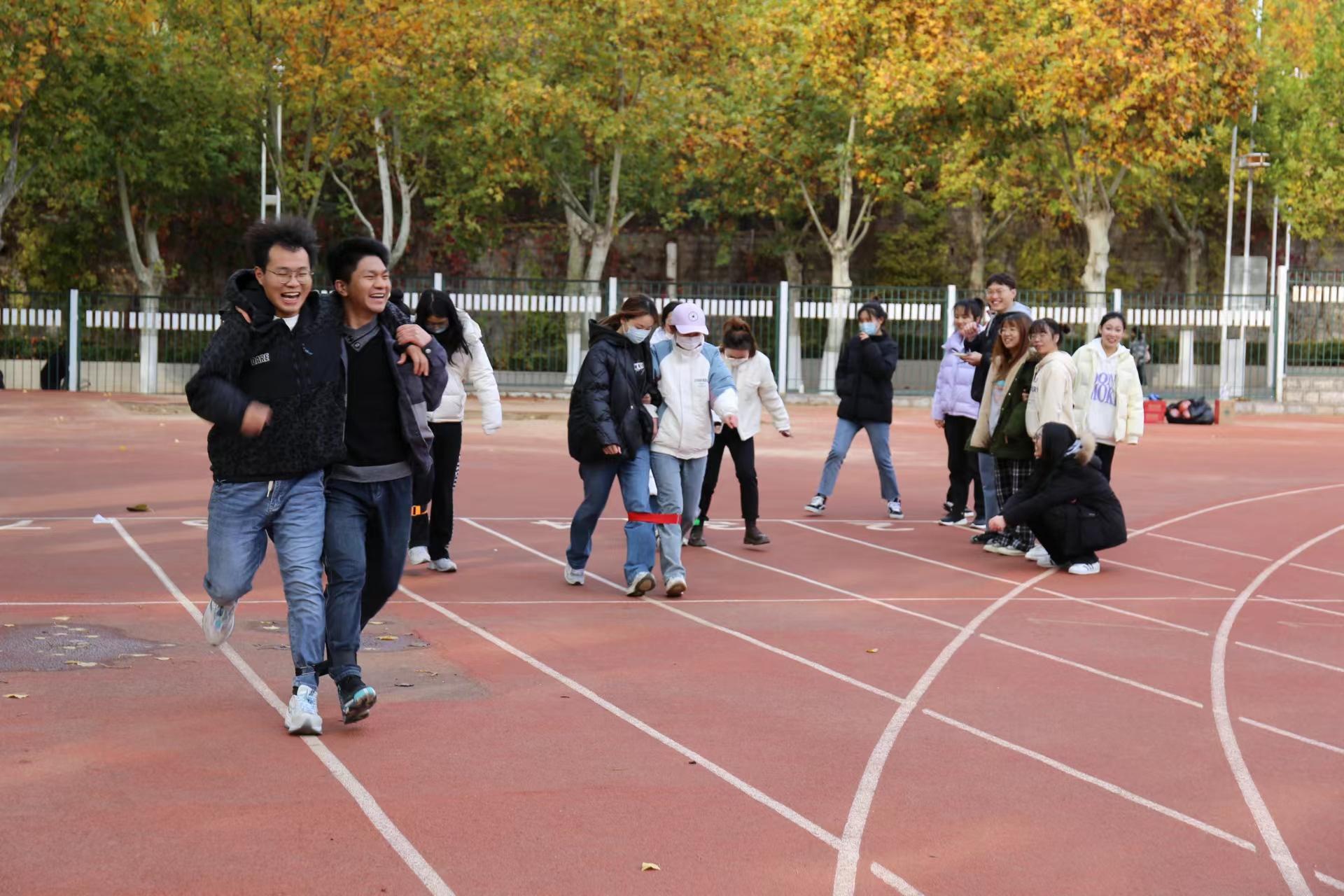 本次运动会设有“两人三足”“大象转圈赶球跑”“火车赛跑”和“搭桥过河”等集趣味性与协作性于一体的比赛项目。在“两人三足”比赛中,同学们两两组队,在“1、2、1、2”的口号声与同学们的加油鼓励声中奋勇向前,虽有同学险些摔倒,但为不耽误团队进程,仍拼尽全力冲向终点,所展现出来的奋勇争先、团结协作的精神使在场同学备受鼓舞。短暂休息后,参加“大象转圈赶球跑”的同学马上进入了比赛状态,大家将左臂在右臂下方穿过,左手揪住右耳,原地转五圈后用木棍拨动篮球赶向终点。围观同学积极扮演起监督员的角色,少转圈、球滚出跑道都逃不过同学们的“火眼金睛”,比赛过程精彩纷呈,比赛现场气氛热烈。在最受同学们欢迎的“火车赛跑”项目中, 21位参赛同学分为五组,互相协调配合前进,将现场气氛推向高潮。最后的“搭桥过河”项目,12位参赛选手两两组队,团结协作,想方设法快速到达终点,赢得了场下观众的阵阵喝彩。虽受寒潮影响气温较低,但选手们个个精神抖擞,斗志昂扬,全身心投入到比赛之中,运动场上热火朝天、欢声笑语不断。