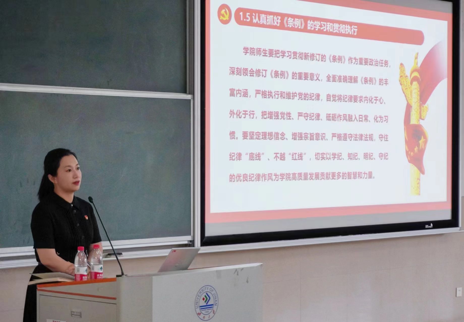 理论学习环节,学院党委书记李春慧为学院2024年上半年党员发展对象、入党积极分子讲授专题党课。党课以《学条例守纪律强党性做表率为全面推进中华民族伟大复兴贡献青春力量》为题,详细解读新修订的《中国共产党纪律处分条例》,引导青年学生高举中国特色社会主义伟大旗帜,争做有理想、敢担当、能吃苦、肯奋斗的新时代好青年,为实现中华民族伟大复兴的中国梦而不懈奋斗。参训师生结合自身学习、工作实际,畅谈感受体会,张帆、姜彤、巩昱杰三位同学分享了自己的入党故事。