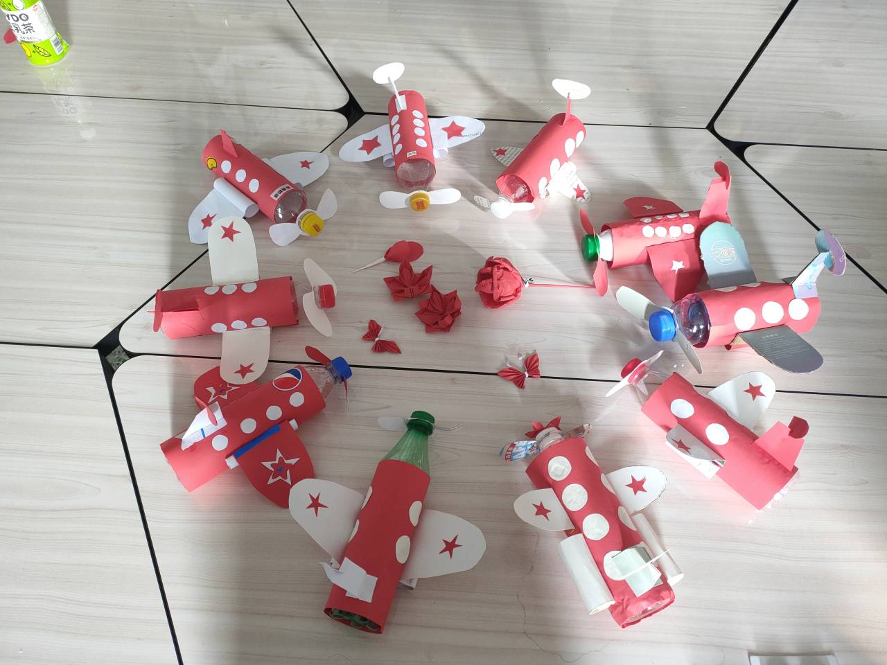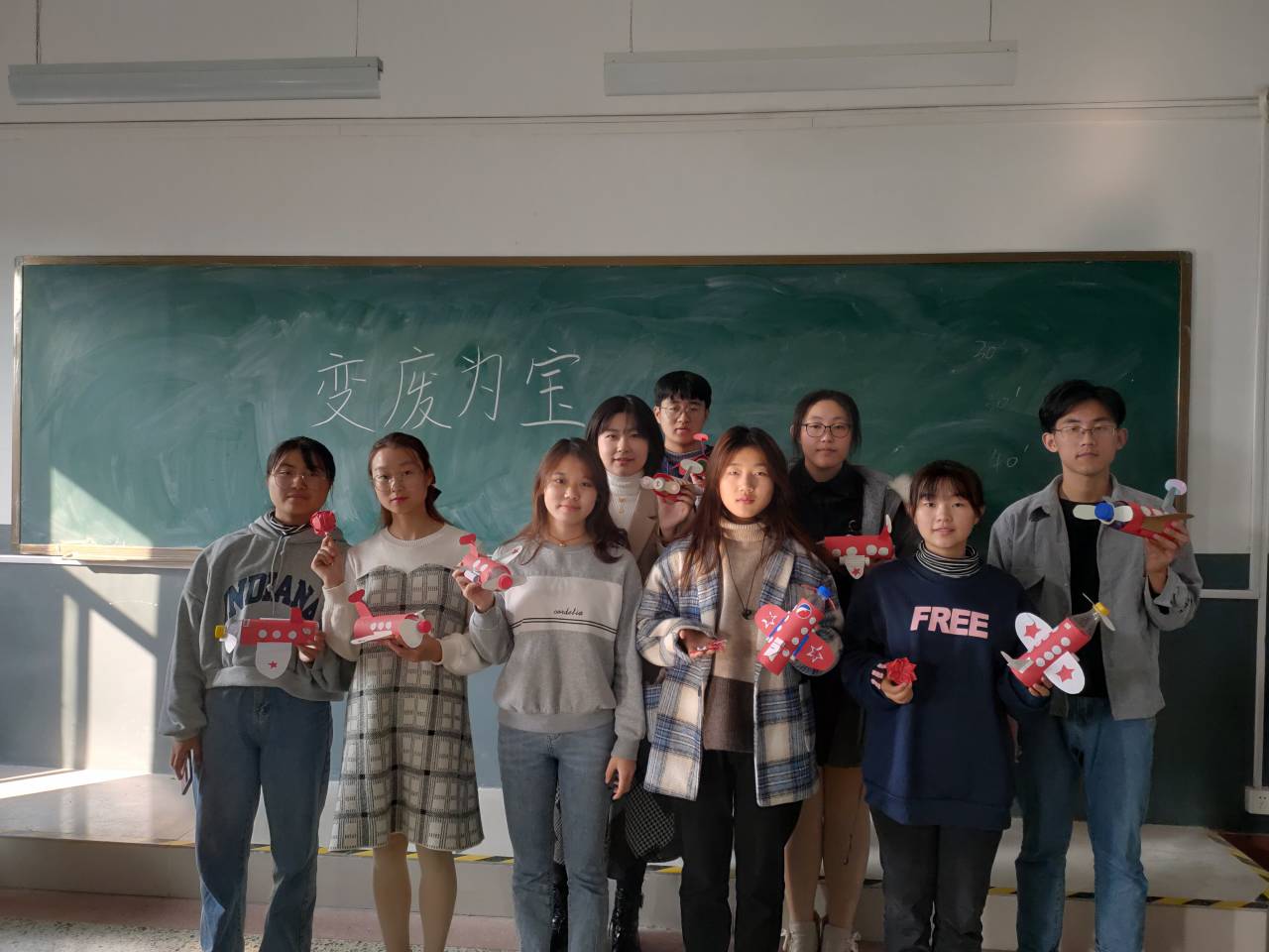 活动前,我院阳光先锋青协将“垃圾分类”活动收集到的一批可回收垃圾作为此次活动的原始材料。早上8:00,志愿者们到达济南大学4教504教室,坐在桌子前对着教学视频,利用收集来的塑料瓶和废纸认真的做着手工。志愿者们用剪刀小心地将废纸裁剪成许多不同的形状,又将它们粘在瓶子上,使原本被丢弃的塑料瓶变成了一架架即将起飞的飞机。在变废为宝过程中,为充分利用资源,志愿者们还将一些废纸折成了莲花灯、玫瑰花和蝴蝶。在活动中,志愿者们不仅学习到了手工小知识,还对环保有了进一步的认知。活动结束时,每个志愿者桌前都有着许多手工作品,他们将作品放于事先准备好的纸盒中,便于后续义卖活动。至此,本次变废为宝活动圆满结束。