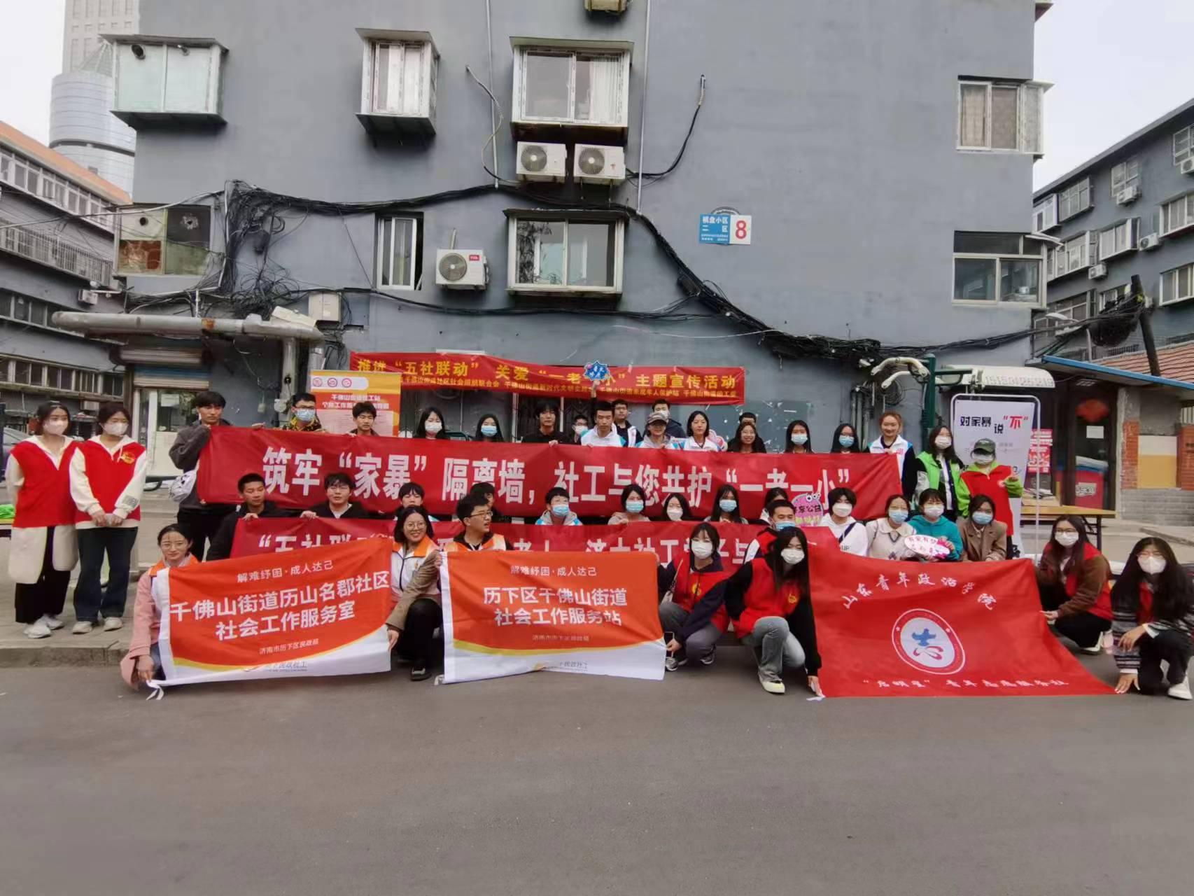 为迎接国际社工日的到来,结合民政部推进“五社联动”关爱“一小一老”的宣传活动主题,我校社会工作专业21级、22级实习生与山东青年政治学院、千佛山社工机构合作,于3月23日下午在千佛山街道棋盘街社区开展了以“反对家庭暴力,保障老年人与未成年人权益,促进家庭社会和谐发展”为主题的宣传活动。