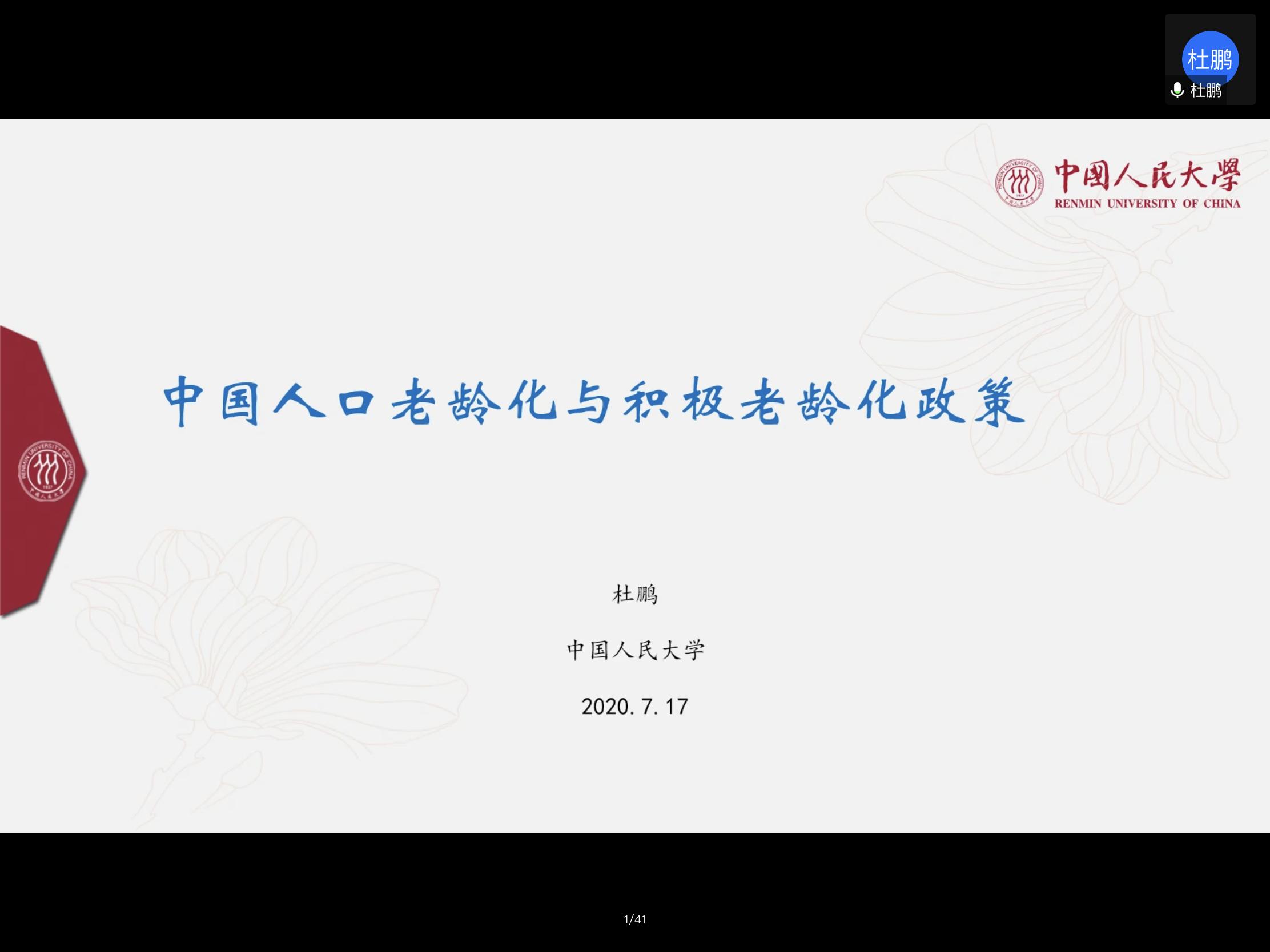 7月17日,必赢电子游戏网站2020暑期系列云讲座首场社会学专场在腾讯会议平台顺利举行。活动邀请中国人民大学副校长、中国人民大学老年学研究所所长杜鹏教授做题为《中国人口老龄化与积极老龄化政策》的专题讲座。讲座由必赢电子游戏网站院长梁丽霞主持,学院师生及相关学者280余人在线参加。
