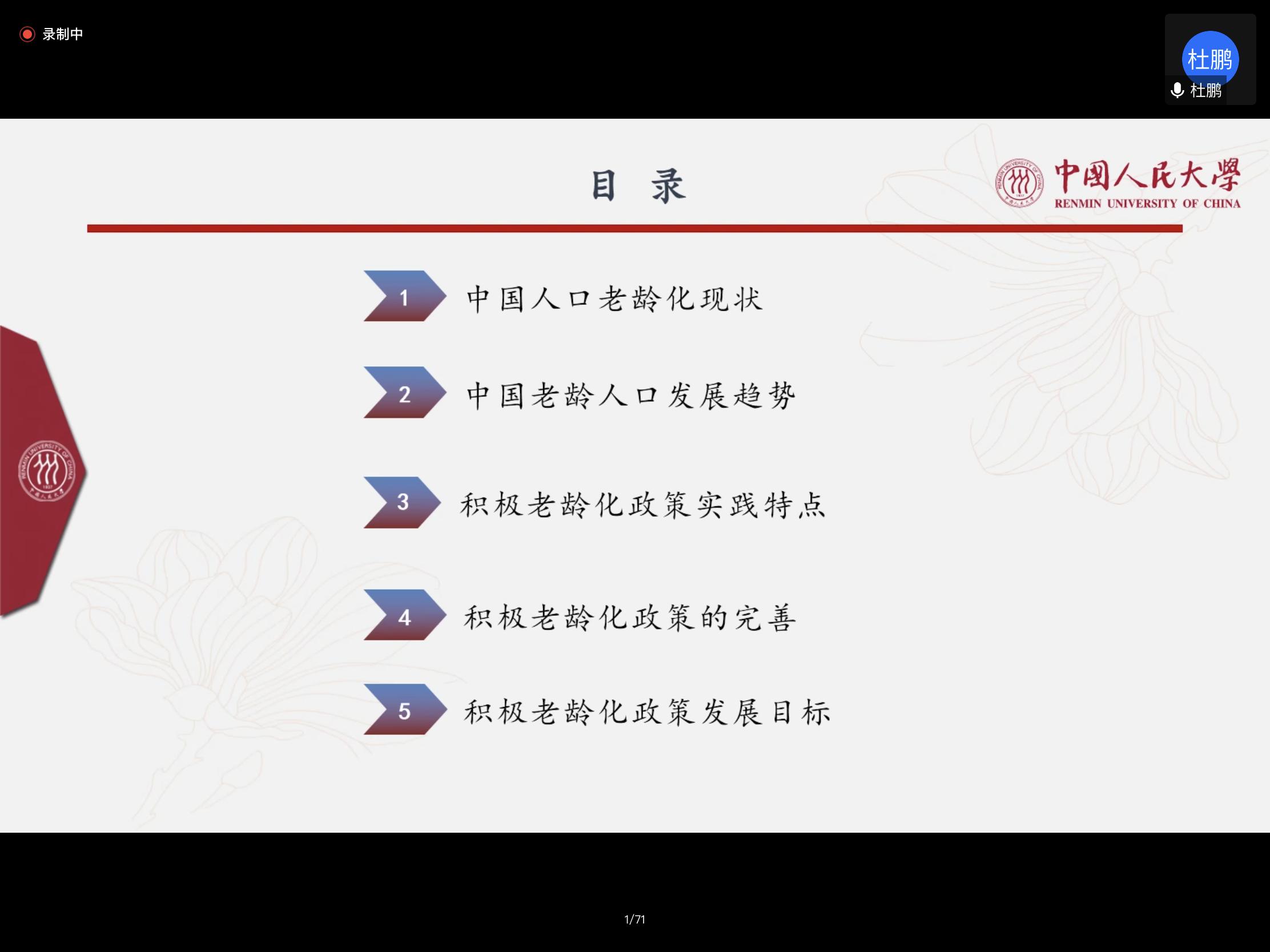杜鹏教授以其充分的论述对中国人口老龄化与积极老龄化政策问题进行了数据翔实、图表丰富的深入阐释和细致讲解,并从中国人口老龄化现状,中国老龄人口发展趋势,积极老龄化政策实践特点,积极老龄化政策的完善,积极老龄化政策发展目标等方面开展交流。其中,在谈及中国老龄人口发展趋势问题时,杜鹏教授结合自己的最新研究成果同与会师生进行分享,用翔实的数据和清晰的图表揭示出新时代中国人口老龄化三大突出特点。杜鹏教授详细阐述了积极老龄化政策划分的四个维度,并就我国近些年来出台的相关政策进行划分与分析。杜鹏教授认为,积极老龄化政策在制定时需要更加的精准科学,执行过程中更具操作性,其效果更能够得到绩效评估的验证,以上这些都是积极老龄化政策需要不断丰富完善的问题。最后,杜鹏教授指出,现在的积极老龄化政策无疑是取得了很大的进步,但依然还具备更大的发展空间去做的更好,下一步应当更加注重加强顶层制度设计,构建积极老龄化政策的社会治理体系,用全生命周期理论指导积极老龄化政策与实践,以老年人需求为中心,为其增权赋能,为其社会参与创造良好的社会文化环境并就以上方面进行了相关对策分析。报告结束后,杜鹏教授同与会师生就养老服务政策及相关社会工作、健康老龄化新理念等当前老龄化领域的热点问题进行了热烈交流。