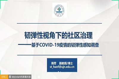 4月24号下午,我院“新冠疫情下的社会治理线上系列讲座”第四期顺利开讲。讲座由我院副教授韩芳老师主讲,讲座题目为《韧弹性视角下的社区治理——基于COVID-19疫情的韧弹性感知调查》。讲座由我院副院长李慧明主持,通过腾讯会议平台,学院师生100余人在线参与和互动。