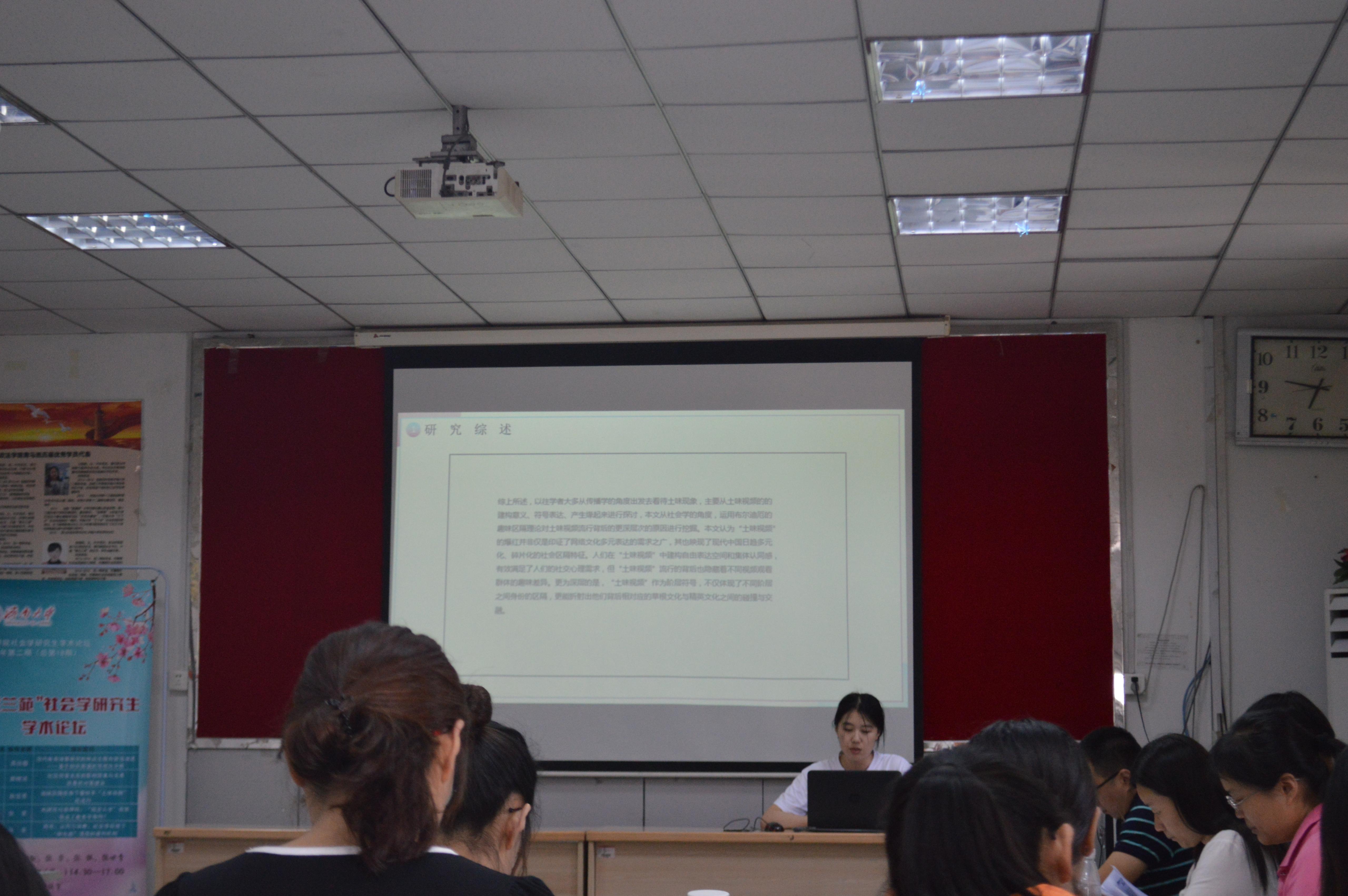 刘延飞、李洁璐、李梦爽、钱一民、王倩茹五位同学分别就题为《国内教育储蓄研究的热点主题和前沿演进——基于知识图谱的可视化分析》《社区邻里关系的影响因素与关系改善的对策建议》《趣味区隔视角下看快手“土味视频”的流行》《先赋性与获得性:“就近入学”政策促进了教育平等吗?》《符号、认同与消费:社会学视域下“御宅族”情感的建构机制》的论文进行了PPT展示与分享。四位老师从题目规范、理论运用、文章的深度与落脚点、研究方法等方面进行了充分的评价,并给出了具体可行的建议。