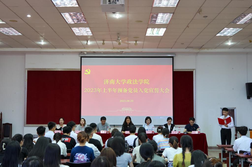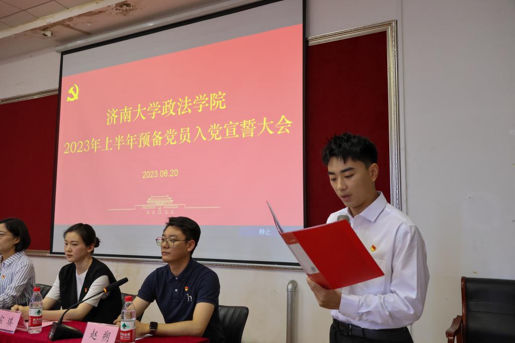 大会在庄严肃穆的《国际歌》声中拉开序幕。学院团委书记刘晓娟宣读新发展党员名单,与会领导、老师为预备党员代表佩戴了党徽,赠送《中国共产党章程》。全体新党员面向党旗站立,举起右手握拳,在法学学生第二党支部书记房仕琪同志的领誓下,进行了庄严宣誓。党员们昂首挺胸,在阵阵激昂的宣誓声下,每个党员均用心传递着他们昂然向上的斗志和报效祖国的决心。公共管理学生党支部党员骆凯霖代表新发展预备党员进行了发言,他讲述了自己入党前后的心路历程,充分展现了一名新党员的蓬勃生机与殷殷成长。并表示今后一定会加强理论学习,严格要求自己,坚决拥护“两个确立”,做到“两个维护”,增强四个意识,坚定四个自信,努力成为合格的中共党员。社会学研究生党支部书记王丹代表正式党员发言。她梳理了自己入党以来的成长与蜕变,真情抒发了一名老党员对党的忠诚之怀与对人民的热忱之心。并鼓励同志们自觉践行新思想,时刻牢记新使命,刻苦锻炼新本领,奋发展现新作为。
