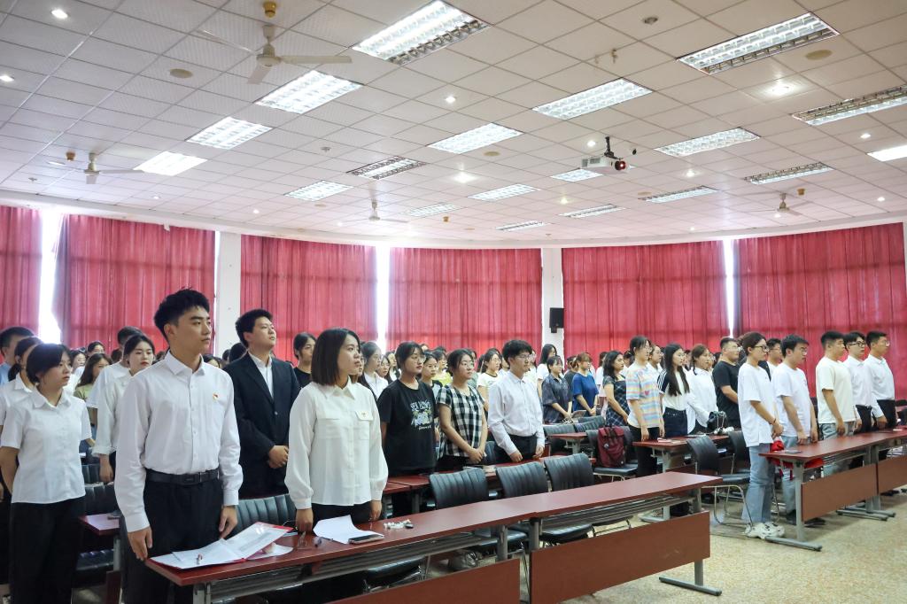 为进一步做好党员发展工作,使党员增强“四个意识”、坚定“两个自信”、做到“两个维护”。6月21日,必赢电子游戏网站党委在第四教学楼模拟法庭召开2023年上半年预备党员入党宣誓大会。学院正处级组织员国迎春,学院党委副书记、副院长李涛,团委书记刘晓娟,公共管理学生党支部书记迪妮尕尔·艾尔夏提,法学学生第一党支部书记宗琪,法学学生第二党支部书记房仕琪以及新发展的预备党员参加会议。会议由思想政治教育学生党支部书记赵朔主持。