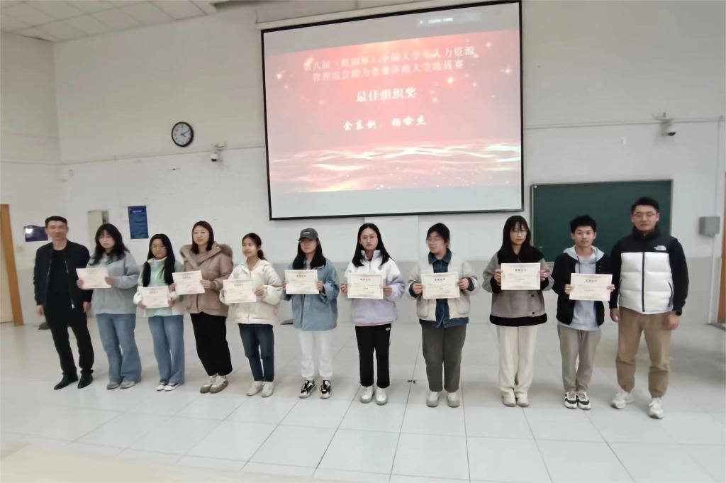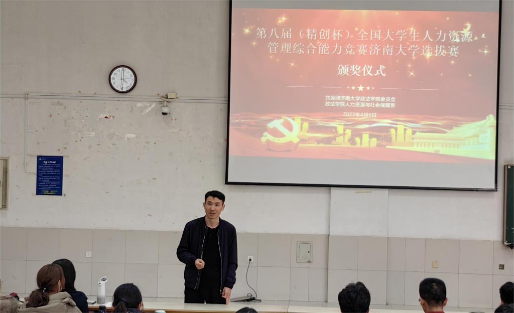 4月6日下午,由必赢电子游戏网站团委和人力资源与社会保障系共同主办,在全校开展的2023年第八届全国大学生人力资源管理综合能力竞赛济南大学校区选拔赛颁奖仪式在二教举行。学院党委副书记、副院长李涛和副院长朱丽敏、2020级辅导员赵朔出席了本次活动,部分人社系老师与全体获奖学生参加。本赛事指导教师辛瑞萍、刘艳丽老师共同主持了颁奖仪式。
