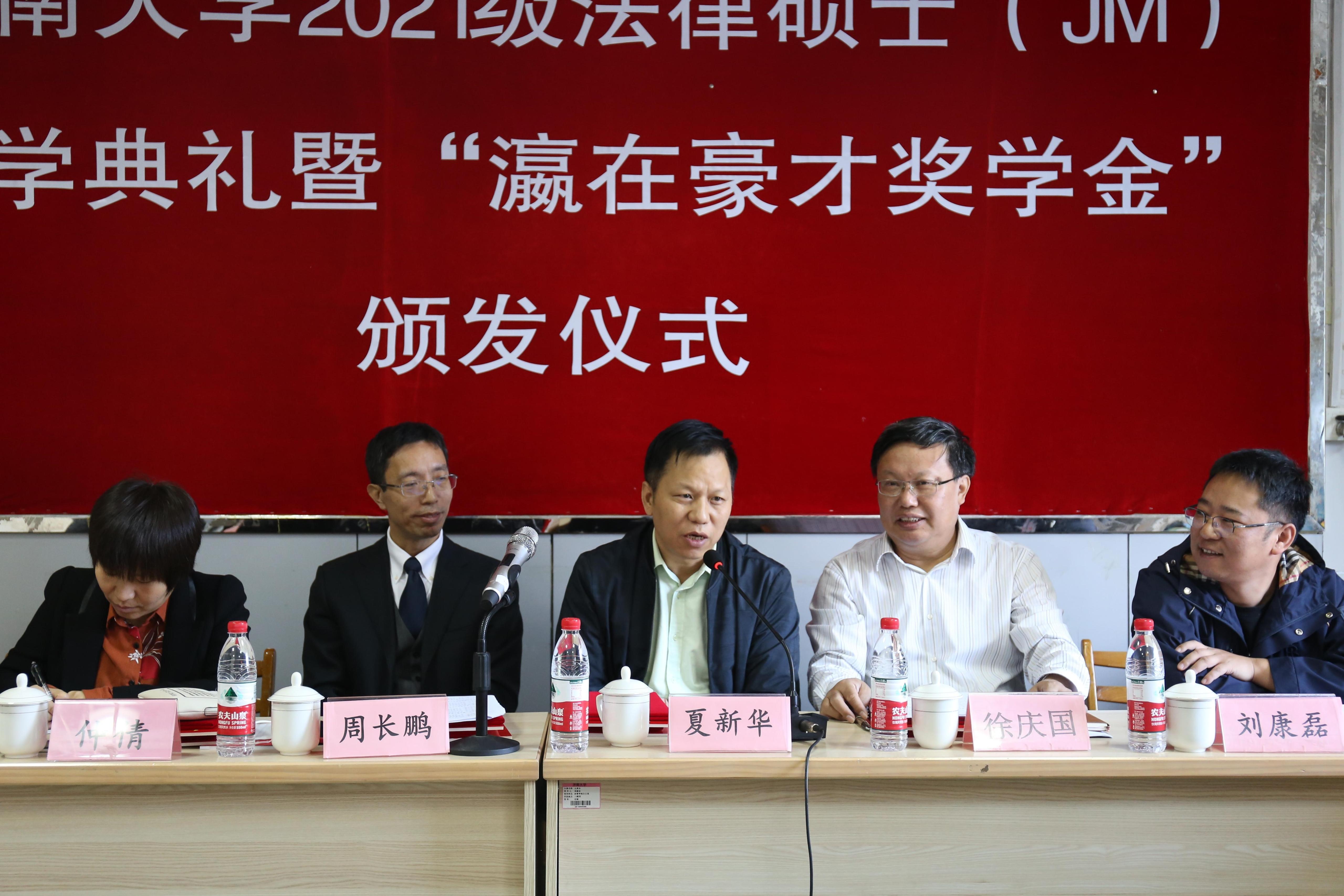 仪式的第一个环节,徐庆国书记代表必赢电子游戏网站全体师生对2021级法律硕士新生的到来表示热烈的欢迎,对支持我校法律硕士教育事业发展的专家、领导和导师表示衷心的感谢。夏新华教授在致辞中阐述了再次来到济南大学的心情,表达了对济南大学法律硕士教育事业前景的期许。周长鹏主任表示非常高兴能与必赢电子游戏网站加深合作,期盼同学们努力学习、期待瀛在豪才奖学金让更多同学受益。校内导师代表苑敏副教授和法律硕士新生代表于文曦同学先后发言。