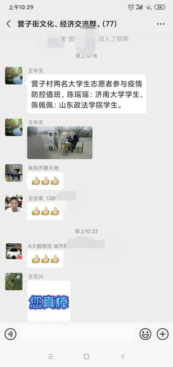 7.社会工作1801班的孙浩然,家住山东省临沂市罗庄区,在2月12日参加了村里大队招的志愿者,被分配到的任务在村子路口处对进出的人员测量体温并且进行人员记录,对村子里的人员进行放行和记录,对外村人员进行劝阻,工作时间是早上七点半到中午11点半,村子大队里有很多村民捐发的物资到村子里,以帮助大家一起渡过难关,感受到疫情面前中国人团结互助的美好传统。到大家一起奉献一起工作的日子让他觉得每天十分充实,虽然是在家里,但是他通过自己的行动将自己与在前线的白衣战士们相互连接一起,为这场战争奉献出自己的绵薄之力。