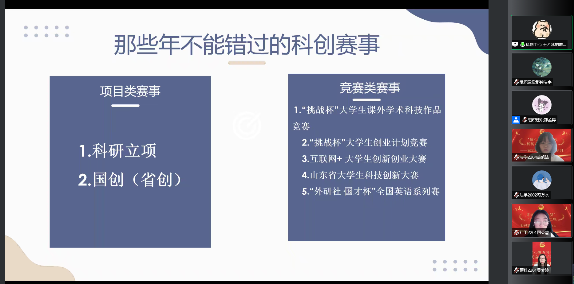 在创新创业工作培训中,学院学生会科创中心负责人王若冰向大家系统介绍了“挑战杯”“互联网+”等科创赛事的参赛流程,并提供了详细的经验方法,有助于各位团干部培养创新意识,拓宽维度,提升高度。