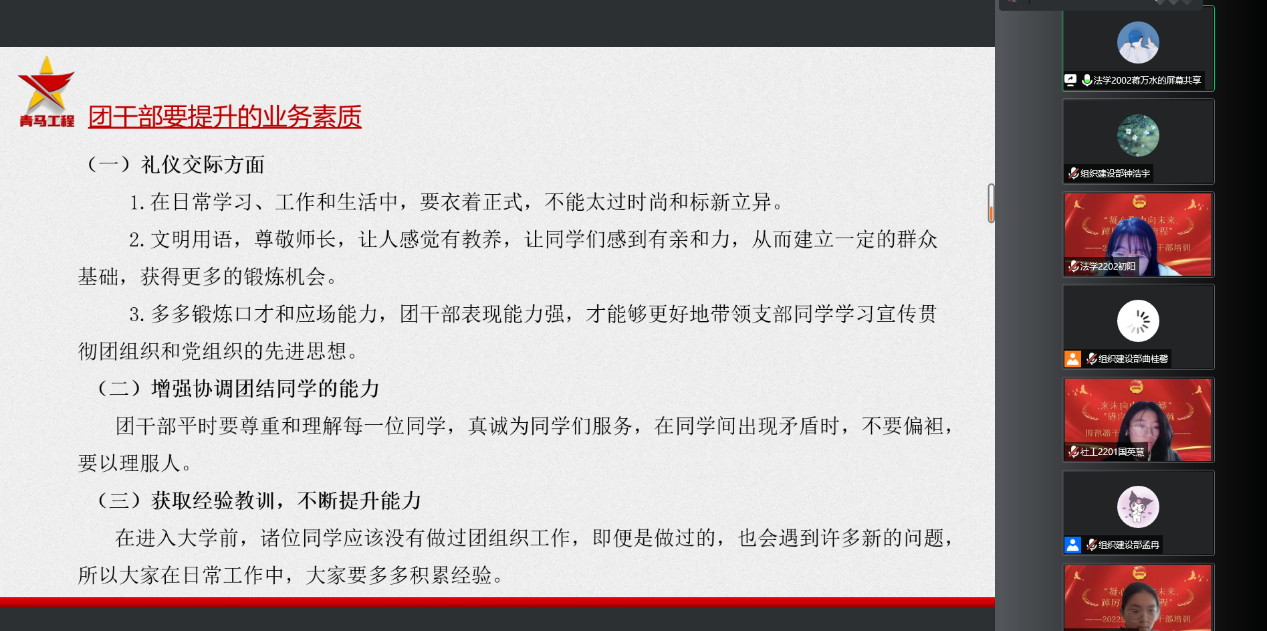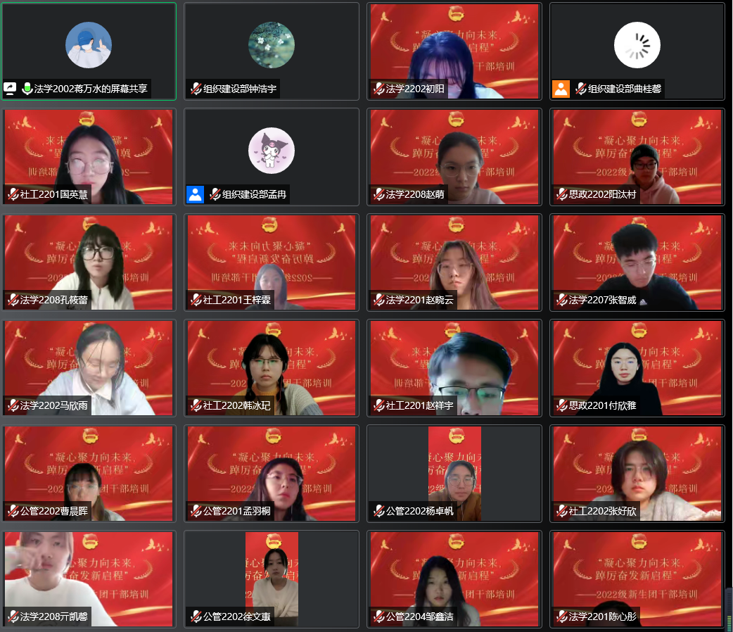 为学习贯彻党的二十大精神,落实好习近平总书记关于青年工作的重要思想和关于教育的重点论述,提高新生团干部教育培训工作的科学化、制度化、规范化水平,激发团干部的工作热情,培养高素质团干部队伍,近日,学院以线上形式开展“凝心聚力向未来,踔厉奋发启新程”2022年团干部培训活动。