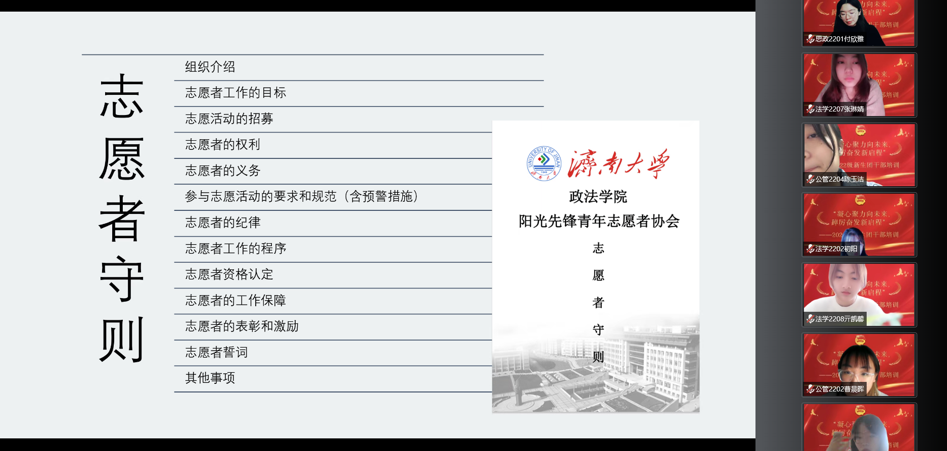 在志愿服务工作培训中,学院阳光先锋青年志愿者协会办公室负责人姚佳燕通过照片、视频等形式展现以“一路青风,携爱同行”为理念的学院志愿活动,帮助团干部培养“志愿精神”。
