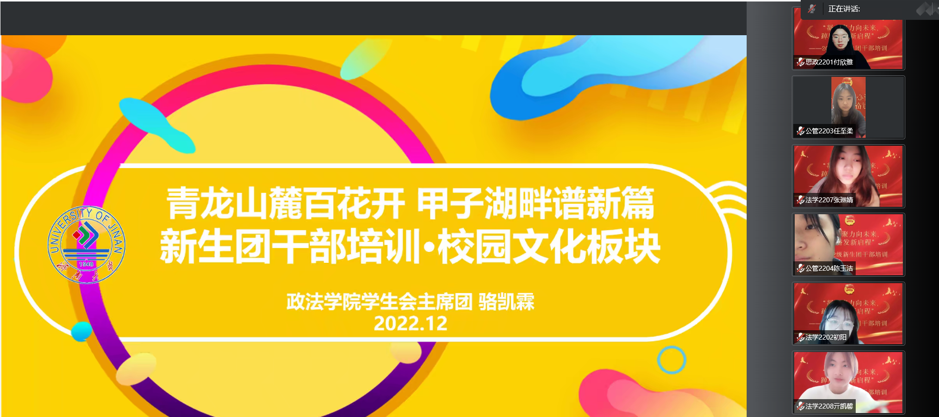 在校园文化工作培训中,学院学生会主席团成员骆凯霖为新生团干部介绍了丰富多彩的校园文化,为新生团干部全面发展提供帮助,鼓励他们为校园文化建设贡献青春力量。