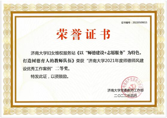 济南大学妇女维权服务站始终把师德师风建设摆在突出位置,倡导以德立身、以德立学、以德施教,将师德建设与志愿服务相结合,打造树德育人的教师队伍,取得显著成效。2019年全国妇联授予服务站“全国三八红旗集体”荣誉称号。此外,服务站还多次被山东省妇联、省综治办命名为“省级妇女维权服务示范站”、被山东省妇联、省综治办授予“省三八红旗集体”、被山东省委授予“山东省优秀先进基层党组织”、被济南大学党委评为“先进党支部”。服务站的于晓丽老师被全国妇联授予“全国巾帼建功标兵”,被山东省妇联、省综治办授予“山东省维护妇女权益先进个人”、被省妇联授予“山东省巾帼建功标兵”、被济南市授予“三八红旗手”“巾帼建功先进个人”等荣誉称号。袁曙光老师被省委宣传部、省司法厅评为“全省普法依法治理工作先进个人”、被省人民政府法律顾问委员会办公室聘为“省人民政府法律专家库成员”、被济南市人民政府聘为“济南市人民政府法律顾问”、被济南市市中区人民政府法制办聘为“济南市市中区人民政府法律顾问”等。