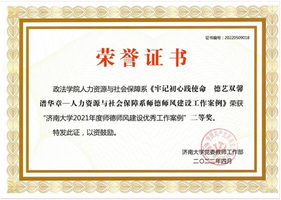 为进一步加强学校师德师风建设,总结推广师德师风建设工作经验,激励学校师德师风工作创新发展,经单位申报、学院审核、学校评审,我院3项案例被评为 “济南大学2021年度师德师风建设优秀工作案例”。其中,行政管理系党支部《坚持党建引领 提升师德师风建设实效》获一等奖,人力资源与社会保障系《牢记初心建使命 德艺双馨谱华章》、妇女维权服务站《以“师德建设+志愿服务”为特色,打造树德育人的教师队伍》获二等奖。