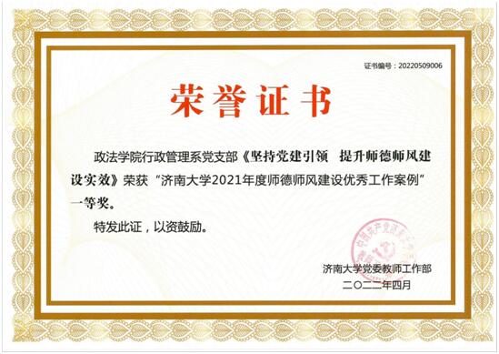 立德先立师,树人先正己。行政管理系党支部始终坚持“党性+品德”“教学+科研”并重,倡导以德立身、以德施教、以德促研,要求老师欲做学问之师,先做品行之师,涌现出济南大学优秀党员、优秀教师等先进代表近10人,在此基础上孵化出优异的教学与科研成果。教学方面,课堂教学评价均为优秀,入选中国专业学位教学案例中心案例库案例5篇,主持山东省本科教学改革项目1项、山东省专业学位研究生教学案例建设项目1项,校院级课程思政示范课3门,获全国公共管理研究生案例大赛二等奖1项、优秀奖1项,获山东省第八届高等教育教学成果特等奖1项、一等奖1项,获“济南大学青年教学能手”称号2人、本科教学贡献奖近40人次,入选山东省理论人才“百人工程”1人。科研方面,主持国家社科基金项目8项、省部级项目近30项,课题经费500余万元,出版专著5部,在《中国行政管理》《山东社会科学》等发表论文100余篇,近10篇被《红旗文摘》、人大复印资料等全文转载,近10项成果获省市相关领导批示或转化。