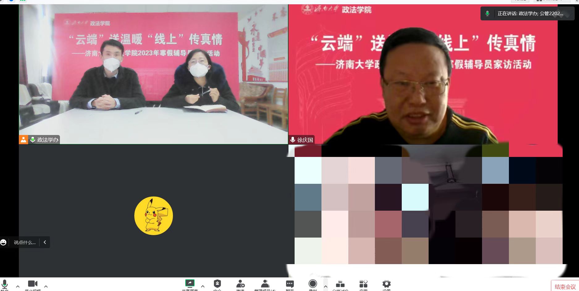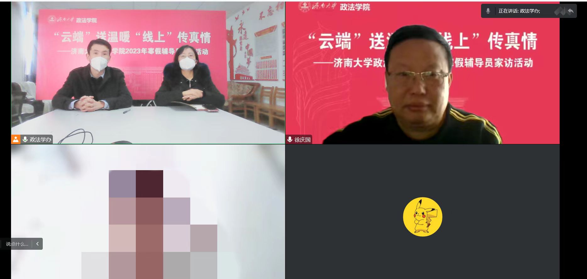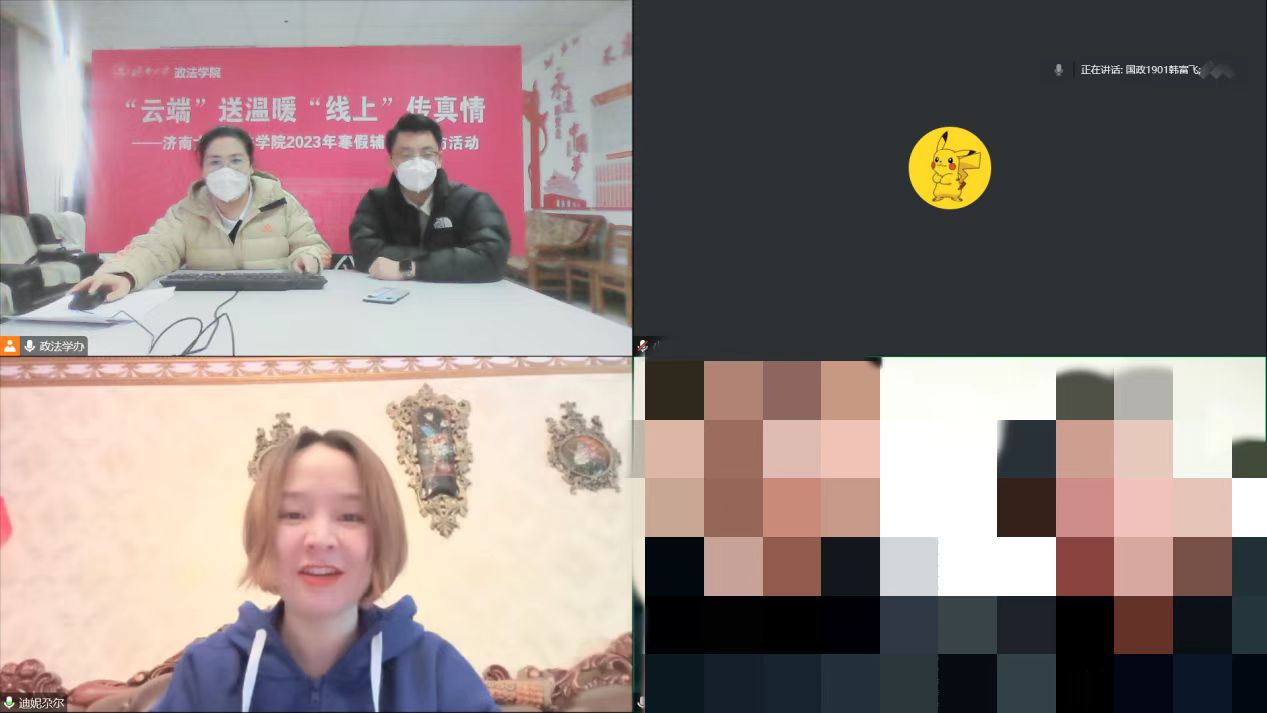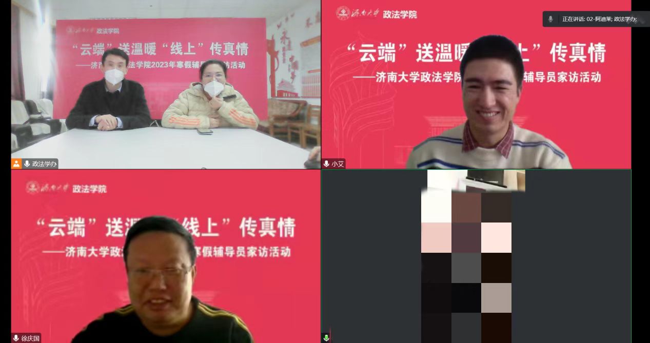 访少数民族,促人生成长。针对学院少数民族学生多、有受疫情影响无法返校的情况,徐庆国书记、李涛副书记及预科班班主任艾尼瓦尔老师一起线上走访慰问2名预科班学生,向学生送上新春祝福及学院的关心和问候,并指导学生在寒假期间做好个人防护、开展学习规划等。徐书记特别讲到在过去几个月疫情防控工作关键时期,学院老师们都非常惦记、关心新疆籍少数民族学生,学生们也没有辜负学院的培养和期待,展现了当代大学生的风采。希望通过家访进一步鼓励锤炼意志品质,牢固树立中华民族共同体意识,自觉维护民族团结与国家统一。