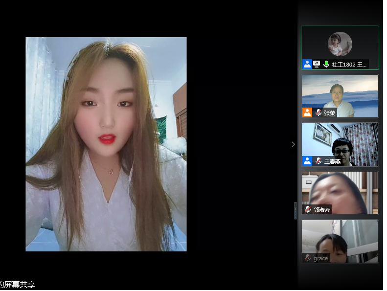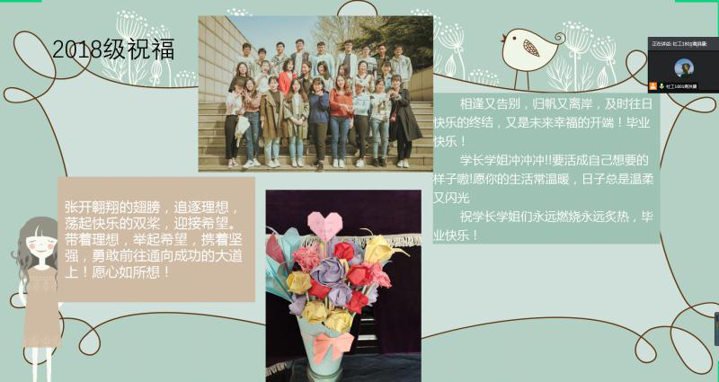 虽然本次毕业生欢送会在云上召开,但会议筹备组在社会学系王春燕老师的指导下,用心积极筹备,为2016级毕业生准备了形式多彩的节目。2019级的戴大磊、陈小淋以及刘菲、王誉瑶分别深情演唱了《起风了》和《歌曲串烧》,歌词中凝聚着期盼,饱含着对学长学姐的祝福;2019级刘慧则带来了热身游戏,不禁让同学们回忆起社工课堂上做游戏互动的点点滴滴;2019级的王晓龙和鲁崇飞(笛子伴奏)带来的诗朗诵《你的眼睛是火焰》,字字真情,声声动情。2019级同学们的精彩演出,不仅展现了新生的风采,而且表达了他们对于毕业学长学姐的送别祝福。2018级贾蕙泽带来的独舞,更为本次云上聚会锦上添花;最后,晚会播放了2018级陈瑶瑶根据2016级同学提供照片所制作的快闪视频,视频中送上了对毕业同学的深深祝福。晚会现场,师生气氛热烈,互动融洽。
