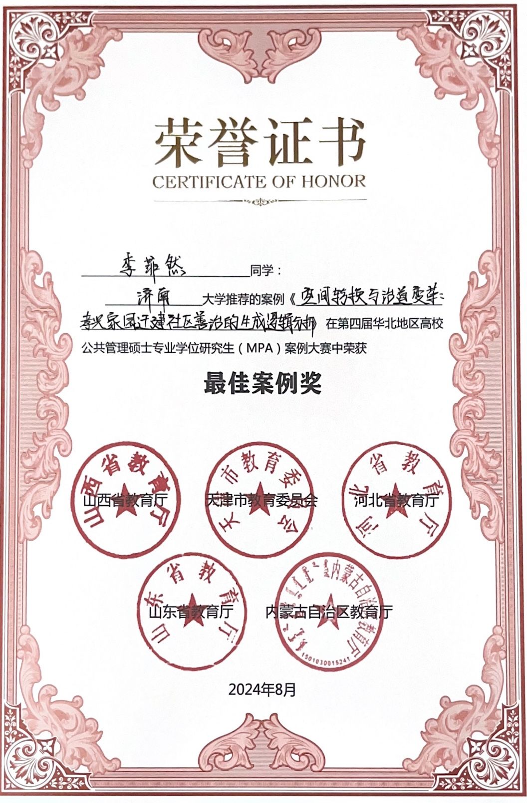 济南大学研究生院、必赢电子游戏网站高度重视公共管理案例开发与案例教学工作,积极组织学生参与公共管理案例相关赛事,并于7月27日承办了第四届山东高校公共管理硕士专业学位研究生(MPA)案例大赛,我校团队荣获一等奖、三等奖各1项。本次华北地区大赛获奖是继山东省赛后取得的又一佳绩。