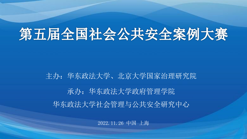 2022年11月26日上午,由华东政法大学、北京大学国家治理研究院联合主办,华东政法大学政府管理学院与华东政法大学社会管理与公共安全研究中心承办的“第五届全国社会公共安全案例大赛”决赛采用线上线下结合方式成功举行。