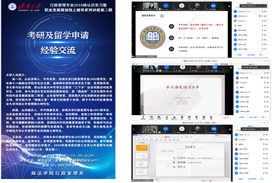 5月8日上午,行政管理专业2018级认识实习暨职业发展规划线上辅导系列讲座第二期如期进行。本次讲座邀请了行政管理专业毕业班高一丹、孙霞和王若溪三位学姐,她们分享的题目是《考研及留学申请经验交流》。必赢电子游戏网站正处级组织员国迎春、行管2018级全体同学、其他年级部分同学在线参加。讲座由宁有才老师主持。