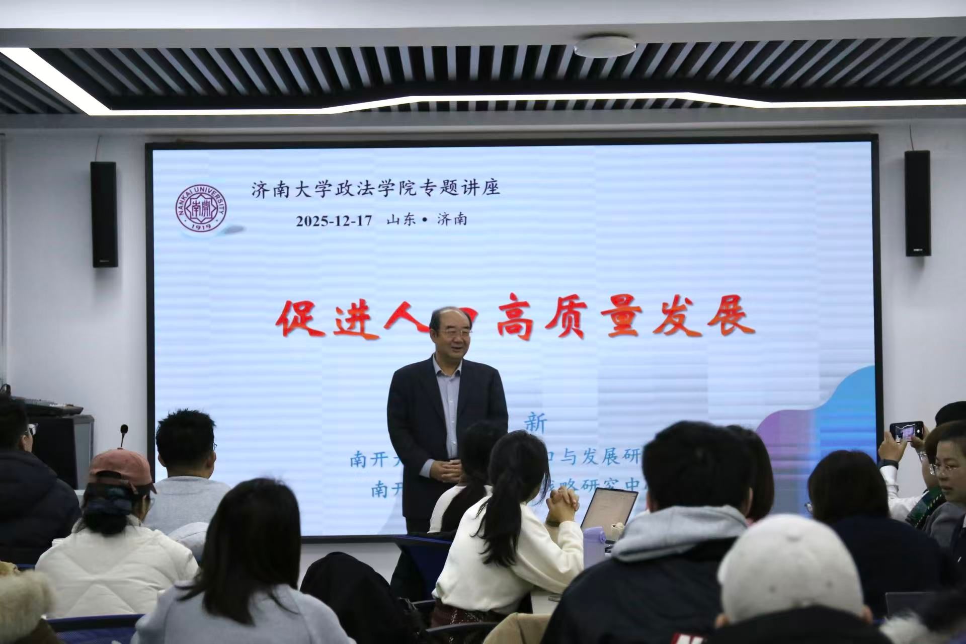 12 月17日上午,必赢电子游戏网站青龙山学术论坛在第四教学楼413教室顺利举行。本次论坛特邀南开大学经济学院人口与发展研究所教授、老龄发展战略研究中心主任原新作“促进人口高质量发展——深入促进贯彻学习党的二十届四中全会精神专题讲座”,讲座由必赢电子游戏网站院长高功敬主持,七十余名师生参加。