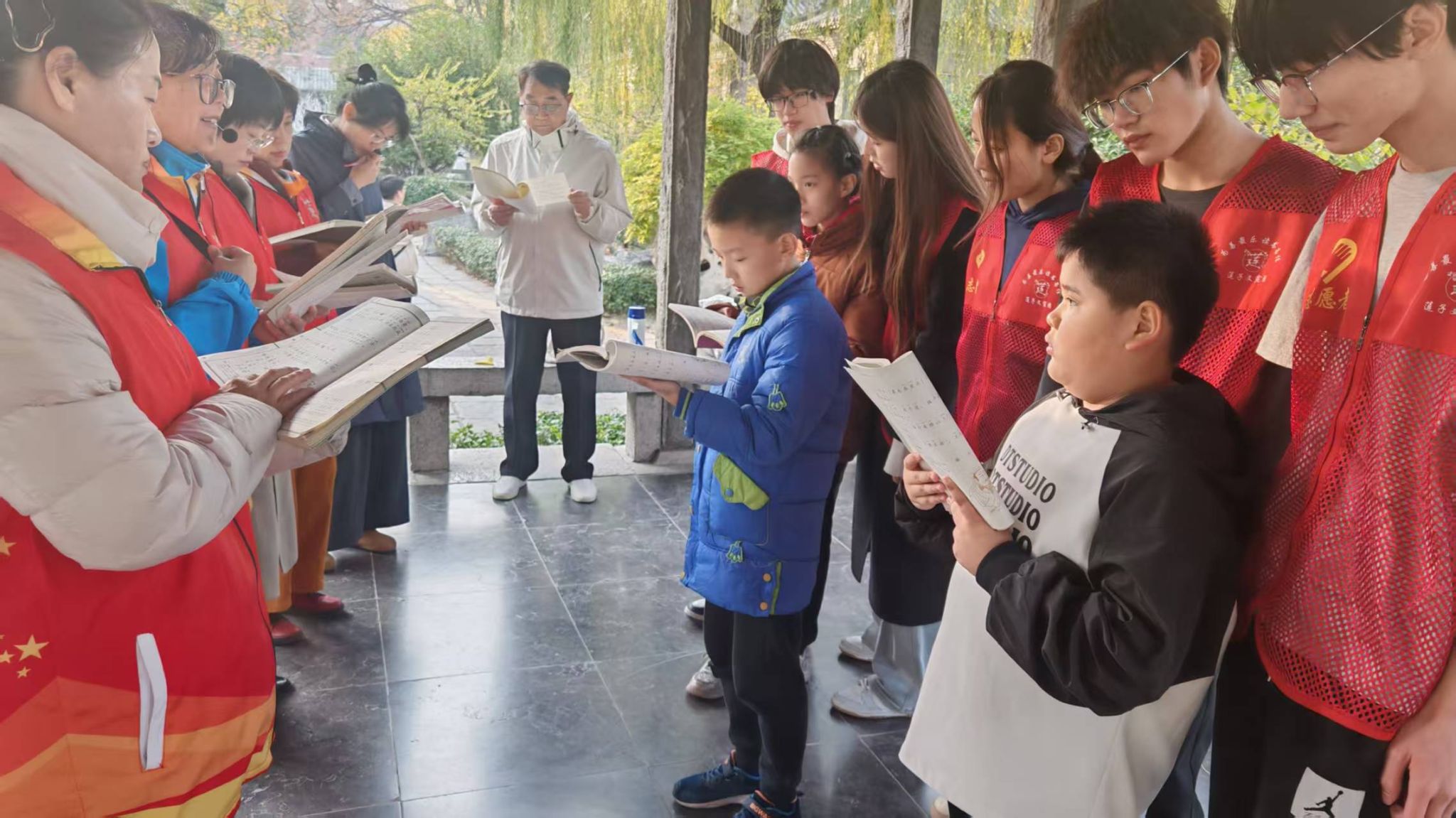 在文宣团老师的指导下,志愿者们首先整理衣冠、正身肃立,认真学习传统揖礼。从拱手姿势到鞠躬角度,志愿者们和孩子们神情庄重,一丝不苟地做着动作,互行揖礼,互相鞠躬,在亲身实践中感受礼仪文化的深厚底蕴。随后进行的《论语·述而篇》诵读环节将活动推向高潮。在老师领诵下,志愿者们和孩子们手捧书卷,跟随着老师的声音,吟诵着一句句古言。抑扬顿挫的诵读声与湖风相和,仿佛完成了一场跨越千年的对话。传统礼仪在体验中"活"了起来,经典文字在诵读中"暖"了起来,在揖礼之形与朗诵之声的双重熏陶之下,志愿者们对中华优秀传统文化的认识更加沁入身心。